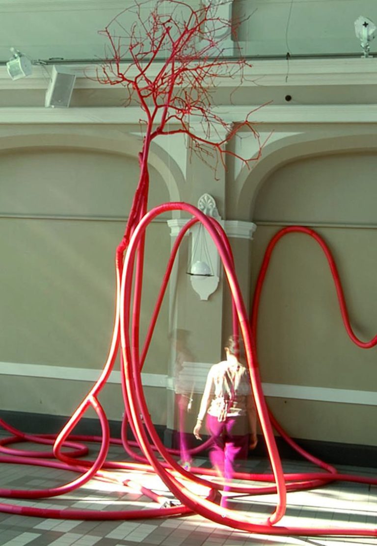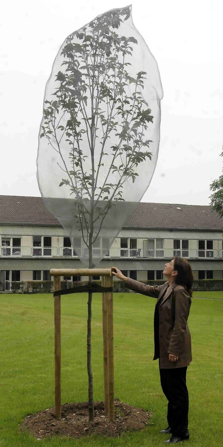 Markierte Physis 2010 - 26, gepflanzter, in Metallgaze eingenähter, geschützt/gefangener Baum und wieder befreit